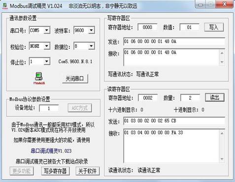 (3)、而根據(jù) Modbus 協(xié)議,當(dāng)寫寄存器的時候,從機(jī)成功完成該指令的操作后,會把主機(jī) 發(fā)送的指令直接返回,我們的調(diào)試精靈會接收到這樣一幀數(shù)據(jù):01 06 00 00 00 01 48 0A。