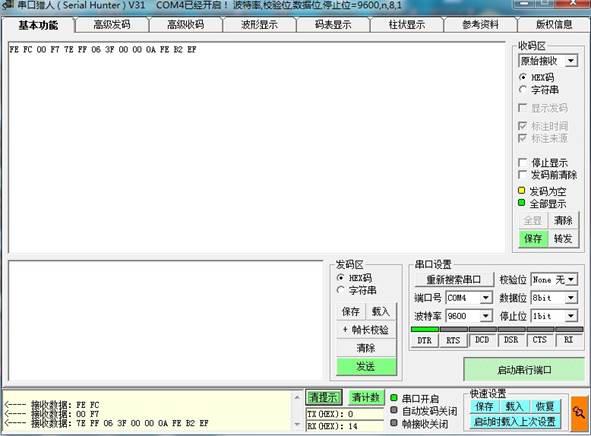 ==> 先 根 據(jù) 手 冊(cè) 里 面 提 供 的 測(cè) 試 命 令 , 測(cè) 試 一 下 串 口 軟 件 的 配 置 , 確 定 這 些 配 置 OK 之 后 , 再 自 己 指 定 一 些 命 令 , 如 果 命 令 沒(méi) 有 被 執(zhí) 行 , 并 且 也 沒(méi) 有 反 饋 信 息 出 來(lái) 。 就 說(shuō) 明 發(fā) 送 到 數(shù) 據(jù) 校 驗(yàn) 和 計(jì) 算 錯(cuò) 誤 。 另 外 還 有 一 種 情 況 , 就 是 串 口 調(diào) 試 助 手 有 問(wèn) 題 , 看 下 面 的 截 圖