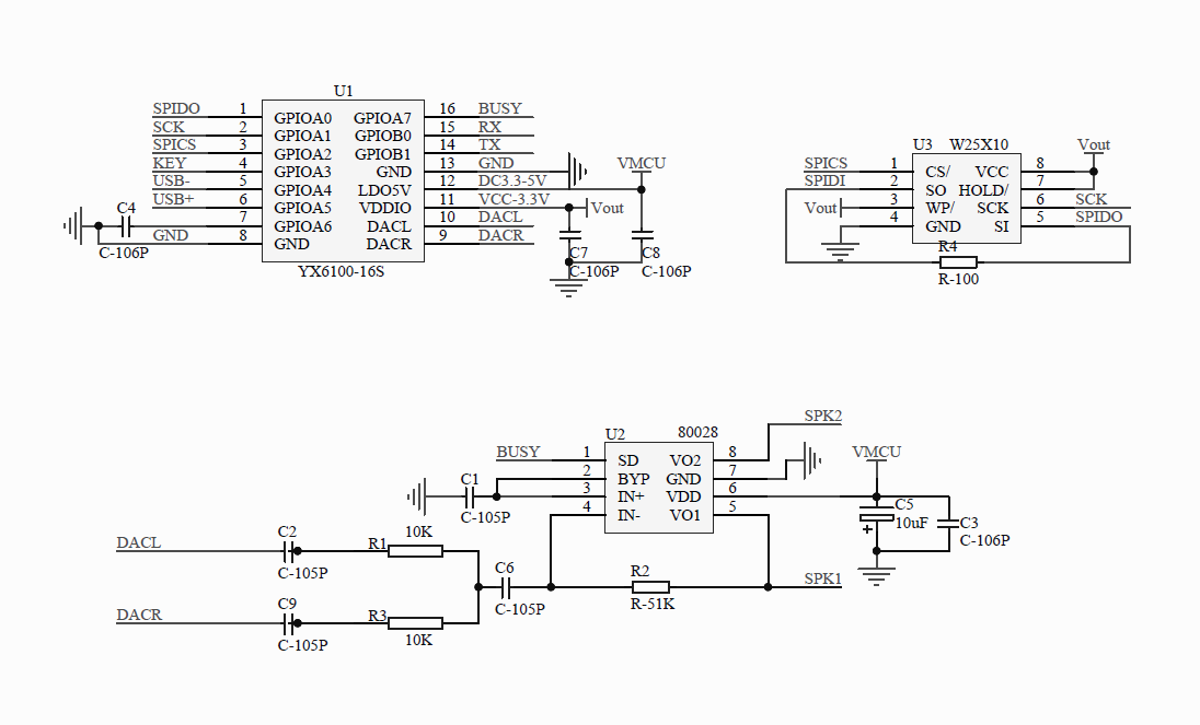 YX6100-16S集成了MP3、WMV的硬解1碼。支持FAT16、FAT32文件系統(tǒng)。直接播放SPI-FLASH卡內(nèi)部歌曲,穩(wěn)定可靠是此款產(chǎn)品的特點(diǎn),芯片體積小,聲音還原清晰,控制方式簡單,是廣大電子工程師快速上手調(diào)試語音程序的,優(yōu)先選擇。