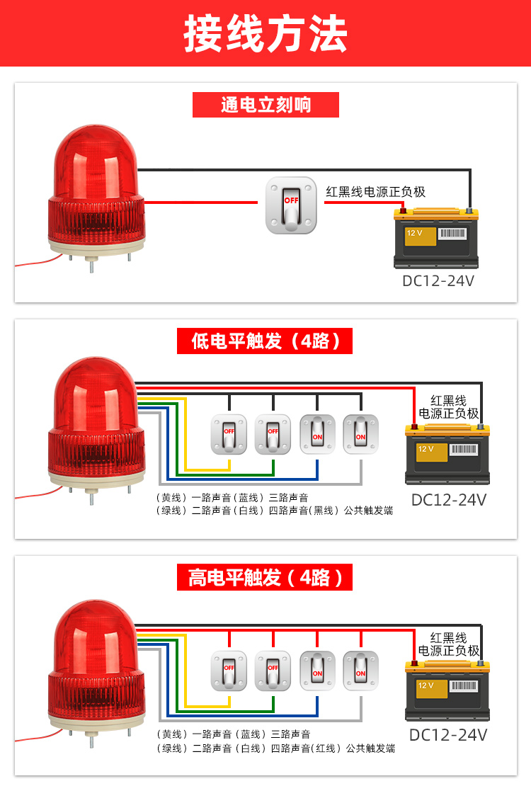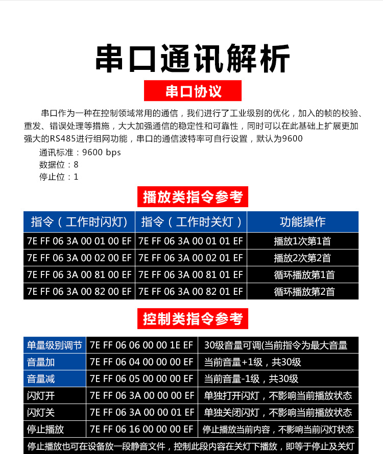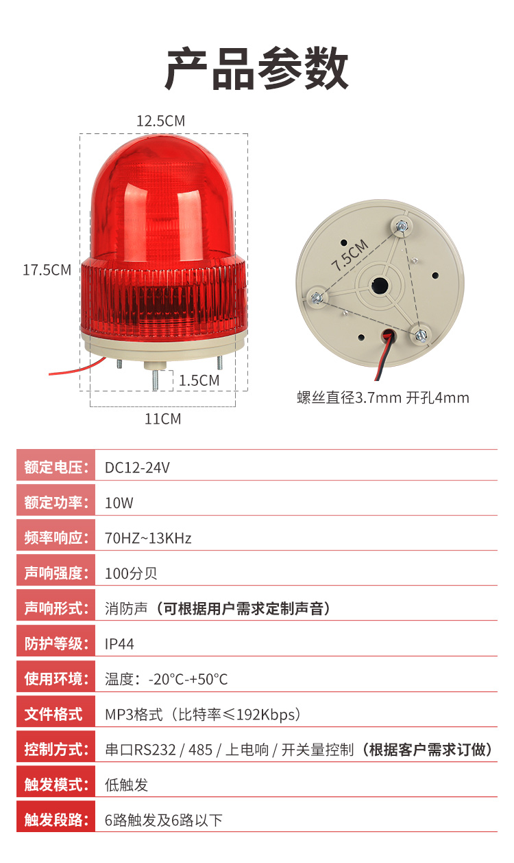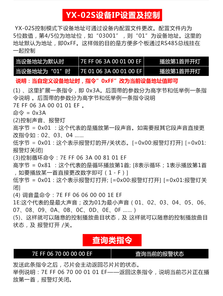 24V串口語音爆閃燈YX02S_多功能燈光語音提示器是悅欣電子2019年新款語音產(chǎn)品,產(chǎn)品可以通過6路開關(guān)量信號(hào)控制6組不同的提示音效,或通過串口RS232、485協(xié)議進(jìn)行多段聲音控制。內(nèi)部帶4M存儲(chǔ)空間,可以直接通過數(shù)據(jù)線載入MP3音頻內(nèi)容。